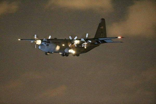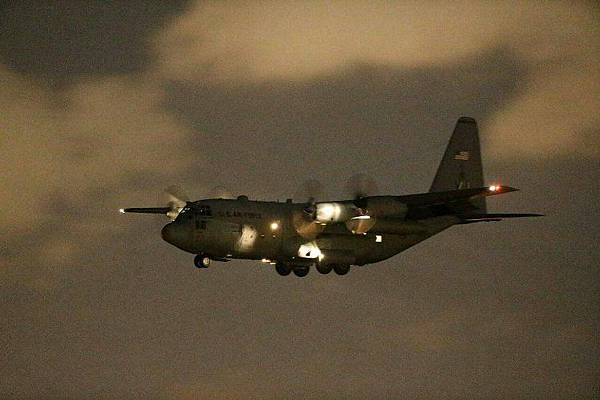 美軍F/A-18C戰機因機械故障降落台南機場,美軍維修人員搭C130運輸機自日本廣島基地出發,昨晚8點多抵台南基地,C130尾翼明顯可見美國旗塗裝。(本報系照片)