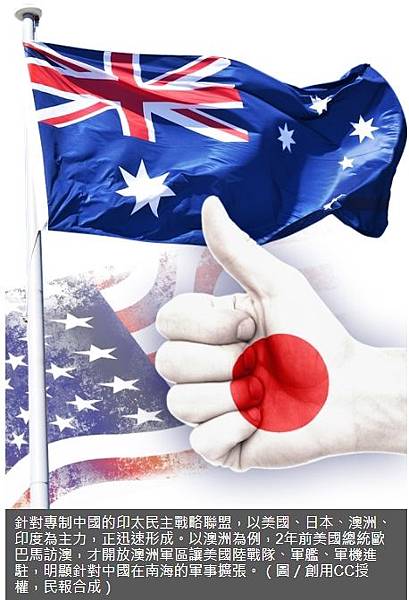 針對專制中國的印太民主戰略聯盟,以美國、日本、澳洲、印度為主力,正迅速形成。以澳洲為例,2年前美國總統歐巴馬訪澳,才開放澳洲軍區讓美國陸戰隊、軍艦、軍機進駐,明顯針對中國在南海的軍事擴張。