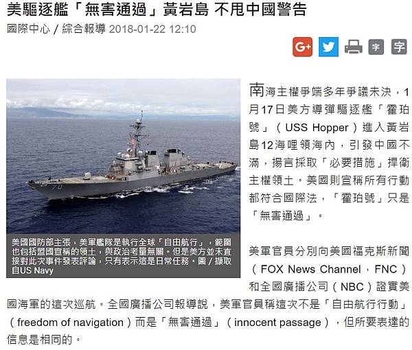 美驅逐艦「無害通過」黃岩島 不甩中國警告