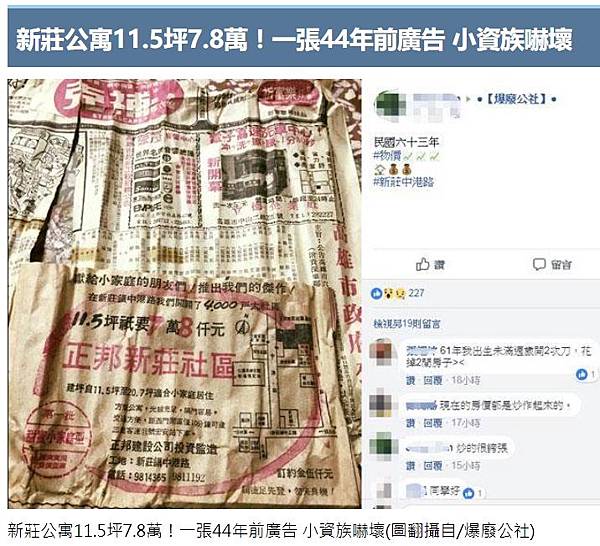 網友在《爆廢公社》PO出一張民國63年的舊報紙廣告,上面印有「獻給小家庭的朋友們,推出我們的傑作!在新莊鎮中港路我們開闢了4000戶大社區」,更標示新莊社區的公寓11.5坪只需7萬8千元,換算下來一坪只需6783元。廣告還介紹該公寓交通方便,步行10分鐘即可至鬧區。照片一貼出後,有不少小資族表示「看了好想哭」、「生不逢時啊」、「我是不是生錯年代了」。