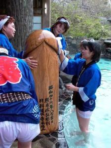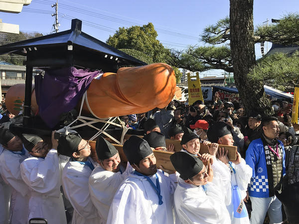 日本生殖器崇拜遊行,在九州、信州、名古屋等地,在某些盛大節日,婦女們要去神廟向這些男性生殖器狀物焚香膜拜,甚至抬著這些東西遊行。例如,在名古屋以北的小牧市,神社所奉祀的就是男性的生殖器。這間神社在每年的3月15日都要舉行豐年祭,這是日本人認為古來有名的“天下奇祭”。