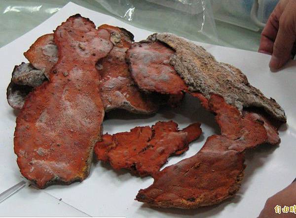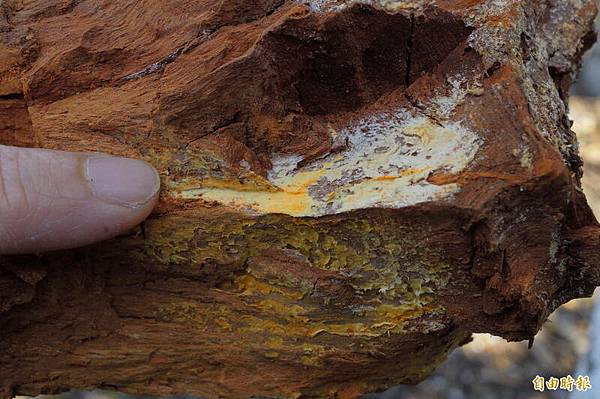 這批野生牛樟木因放置多年已經腐朽,不過內部卻爬滿牛樟菇菌絲體(橘紅色處),不須植菌即可長出牛樟菇,此種野生牛樟菇市價1台斤約3萬起跳。(記者花孟璟攝)