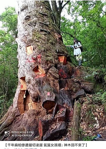〔即時新聞/綜合報導〕台灣的檜木聞名世界,但時常發生檜木盜伐事件。喜歡記錄自然生態的「彭咩」彭唯晨在臉書上說,有一棵千年扁柏巨木本來是個美麗的神木,卻被鋸得亂七八糟,真的讓人覺得遺憾。
