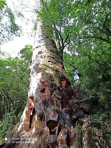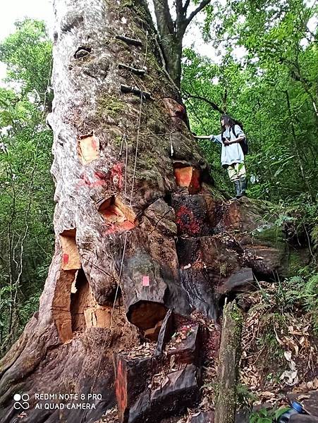彭唯晨說,檜木是一種高貴的木材,尤其是台灣扁柏,品質最好。這棵被鋸得亂七八糟的千年扁柏巨木,本來是個美麗的神木,被鋸成這樣真的很讓人覺得遺憾。帶領她的老師說,每個人是不是可以思考適度闢建這條路線成為登山路線,讓山友進來感受最真實也最震撼的生態教育,山友多了,就能阻止山老鼠繼續在這裡秘密的盜伐檜木林。