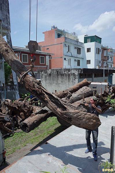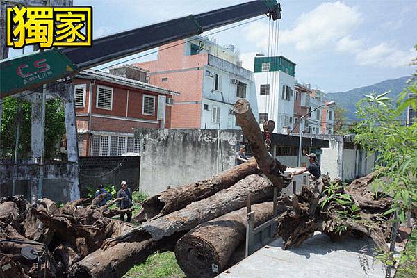 詹姓男子及合夥人今雇大型吊車、板車,將總重34公噸的「貴重木」牛樟木搬離林務局玉里工作站大門,堪稱歷年罕見「山老鼠告贏林務局」案例。(記者花孟璟攝)