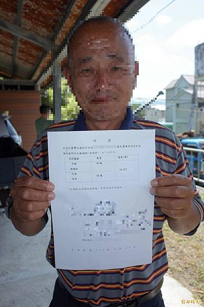 富里鄉詹姓男子今天到林務局花蓮林管處玉里工作站取得領據,順利拿回林務局扣押13年的牛樟木樹頭、角材,共計34公噸,他高興地說「感謝司法還他清白」。(記者花孟璟攝)