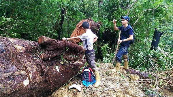 警方在司馬庫斯勘驗遭受山老鼠盜伐的巨木。(記者蔡彰盛翻攝)