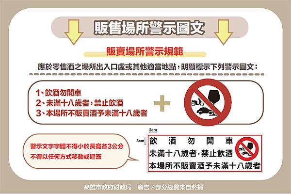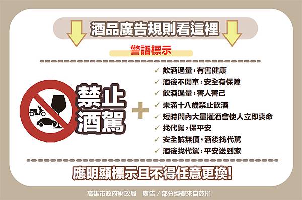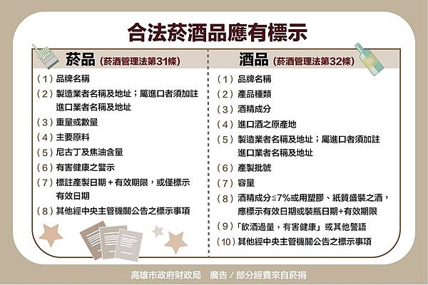 台灣於91年1月1日起廢止菸酒專賣制度,民間業者相繼申請成立、搶攻商機,為維護菸酒市場秩序及民眾消費安全,政府制定了「菸酒管理法」等相關法規加以規範。高雄市政府財政局將這些規範整理成重點事項,呼籲菸酒業者在執業時多加留意,以免獲利不成反倒被懲罰。