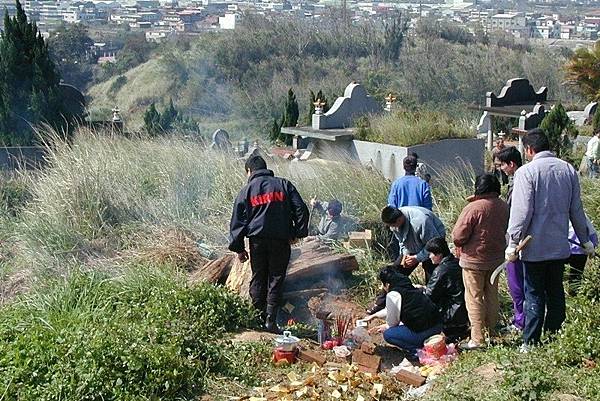 若家族中有新婚的夫婦,就由新人決定整個家族掃墓的時間,除了讓祖先認識家族的新成員,也是讓新人與家族更為熟稔,聯絡彼此間感情。掃墓的時間多為清晨天剛亮時,攜帶著牲禮、炸棗、菜繭前往祭拜。先整理墓地周圍環境,繼而壓「膏」仔錢,燒金紙拜土地公,燒銀紙祭祖。家族成員趁此機會至郊外走走,故也稱為「踏青」、「踏草青」。有的民眾會以白紙錢一排排掛在墳墓上(掛墓紙),意謂為替墳墓整新門面,所以掃墓又稱為「翻厝」。102有的民眾會在祖墳上以石塊「壓墓紙」,表示有後嗣子孫來祭拜。103清明節當天在家裡也要準備飯菜拜公媽。