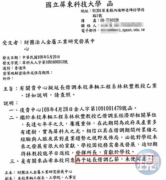 去年5月,屏科大曾回文拒絕林秋豐繼續借調金屬中心。(讀者提供)© Mirror Media 去年5月,屏科大曾回文拒絕林秋豐繼續借調金屬中心。(讀者提供)