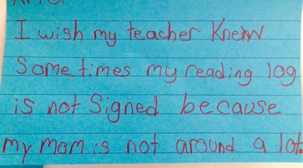 ▲美小學生寫下,「我希望老師知道,有時候我的聯絡簿沒有簽名是因為我的母親過世了」。
