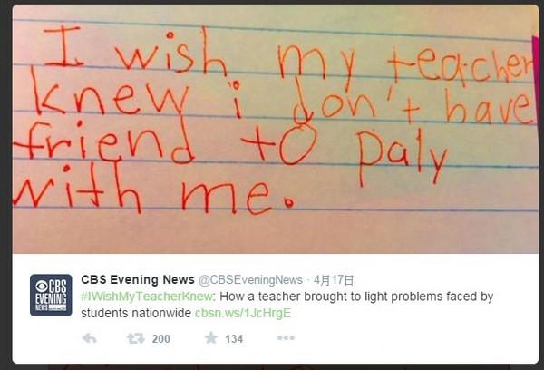 根據《每日郵報》報導,美國科羅拉多州丹佛市道爾(Doull)小學的學生多半都是來自貧窮家庭,為了能夠更了解學生的需求,一名三年級的女教師史瓦茲(Kyle Schwartz)設計了一項課程計劃,要求班上學生寫下「我希望我的老師知道…」的作業,參與者可以選擇匿名回答,但意外的是,多數同學都願意寫下自己的名字,甚至在班上與同學分享。