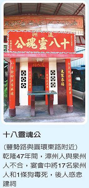 在豐原,也有著一座「十八靈魂公」,在乾隆47年間,漳洲人與泉洲人不和,導致常有械鬥事件發生,當時豐原附近多屬漳洲人,而墩仔腳(后里)、神岡多為泉洲人。後來漳洲人假意要與泉州人和好,設宴邀請泉洲人,實際是要用毒殺的方式殺害,結果在宴會中17名泉洲人以及一隻義犬被毒死。後來地方人士把這17人與義犬合葬,並建「十八靈魂公」祠。