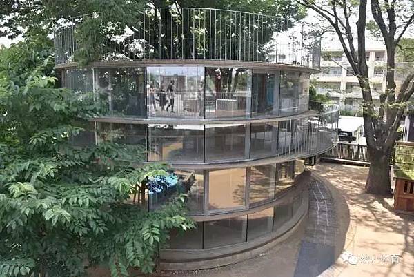 在藤幼兒園入口的左手邊,新建了一座三層建築,他們稱之為「瞭望台」,這裡是幼兒園裡最高的平台之處,站在這裡可以俯瞰整個幼兒園的全貌,加藤園長接待來訪的同行通常第一站都會帶著大家從這裡來俯瞰下面的圓形建築。建築的一層幼兒園的廚房和一個多功能室,樓上則是一個個專用教室,如英語教室等。