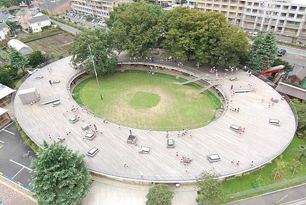 手塚夫婦從大型玩具的概念出發,將校舍設計成一個巨大的橢圓形,屋頂就是操場,小朋友可以在此遊玩,無限制地奔跑。