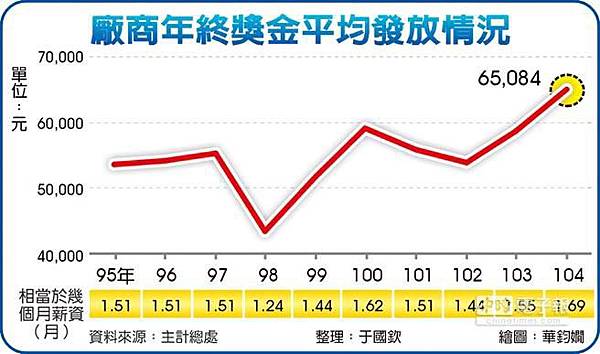 主計總處表示,各業發放的年終獎金時間不一,大約在每年12月到次年的2月,主計總處以這三個月的調查資料推計,發現今年初全體企業發放的年終獎金平均每人為65,084元,相當於經常性薪資(月薪)38,473元的1.69倍,也就是發放1.69個月年終獎金。