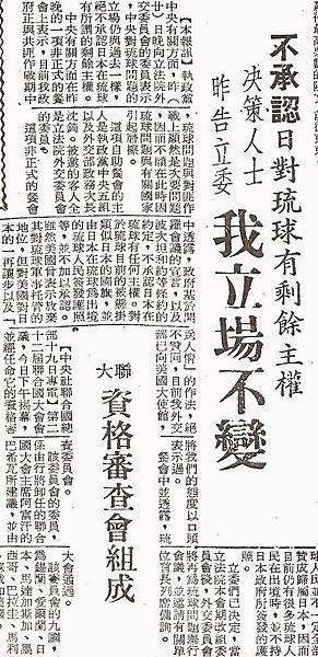 偏偏《經濟日報》9月21日刊出題為〈不承認日對琉球有剩餘主權,決策人士昨告立委,我立場不變〉的報導,內容則是「執政黨中央有關方面,昨(廿)日晚向立法院外交委員會的委員表示,中央對琉球問題的立場仍與過去一樣,絕不承認日本在琉球有所謂的剩餘主權。