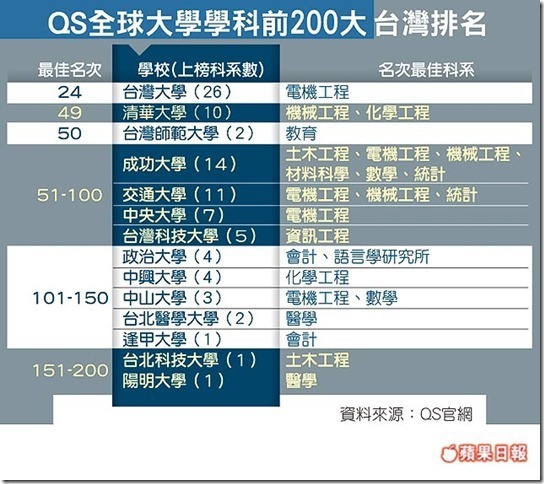 「QS全球學科前兩百大最佳排行 台科大五項上榜」媒體報導。(秘書室) - 國立臺灣科技大學 -> http://www.ntust.edu.tw/files/16-1000-35204.php