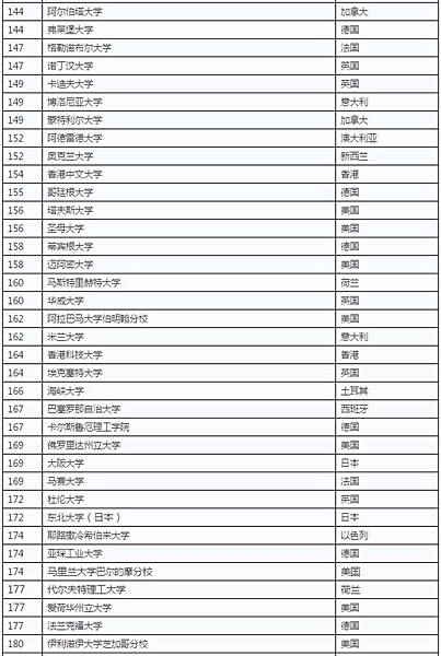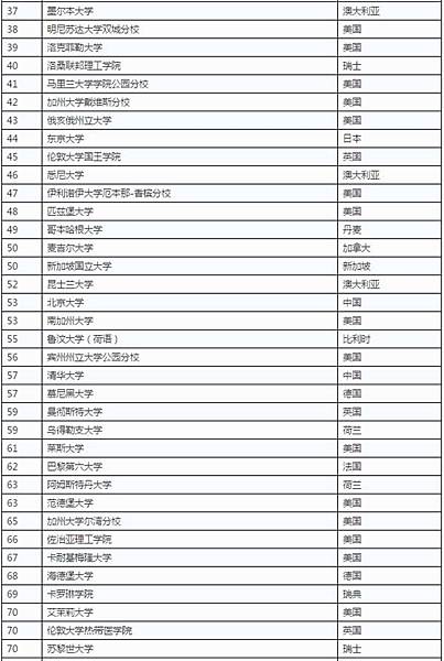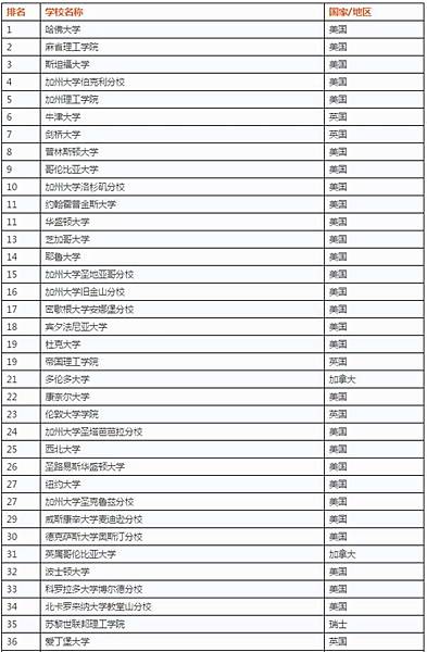 全世界前5名大學分別是:美國麻省理工學院、史丹佛大學、哈佛大學、加州理工學院及英國牛津大學。亞洲排名最好的學校,則是新加坡國立大學排第11名、新加坡南洋理工大學排第13名、北京清華大學排第15名。