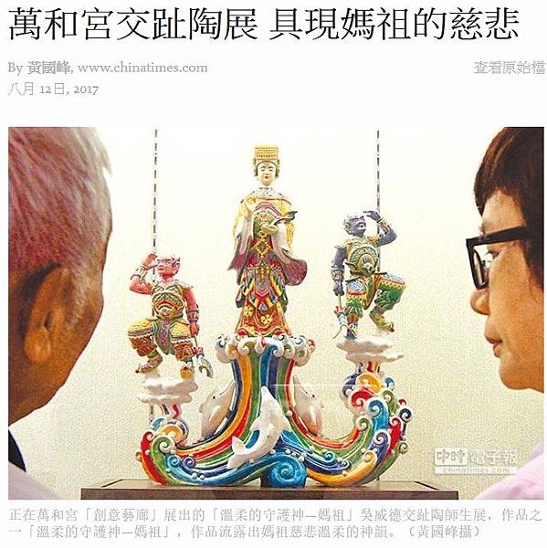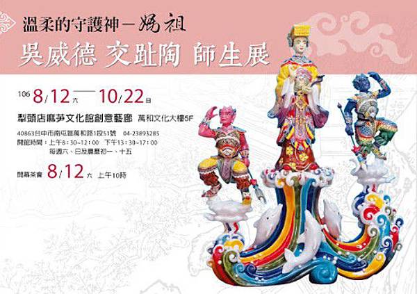 曾四度在國內交趾陶競賽「葉王獎」奪得首獎的吳威德與他的學生,8月12日起在台中市萬和宮「創意藝廊」舉辦為期兩個多月的「溫柔的守護神--媽祖」師生展,展出傳統工藝精緻的創作,內容生動活潑,兼具視覺饗宴及色彩享受。