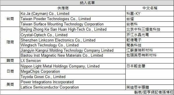 南韓 IC 設計 LX Semicon 也在今年度成為新成員,美商方面,Power Integrations (POWI-US)、Lattice 半導體 (LSCC-US) 加入供應鏈,美信 (MXIM-US)、盛禧奧 (Trinseo)(TSE-US) 則遭剔除。
