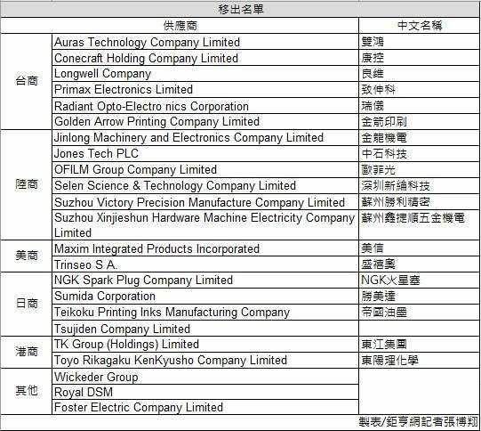 至於遭移出的廠商,包括金龍機電、中石科技、歐菲光、深圳新綸科技、蘇州勝利精密與蘇州鑫捷順五金機電等。其中歐菲光曾是蘋果手機鏡頭模組的穩定供應商,自去年3月被踢出蘋果供應鏈後,業績每況愈下,旗下手機光學鏡頭業務也已出售給聞泰科技。