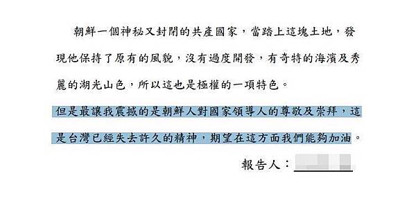 但風景並不是讓這位代表最印象深刻的部分,這位代表又指出,「但是最讓我震撼的是朝鮮(北韓)人對國家領導人的尊敬及崇拜,這是台灣已經失去許久的精神」,還表示「期望在這方面我們能夠加油」。
