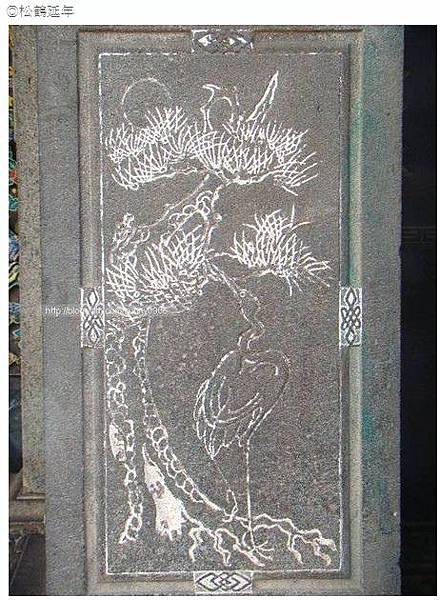 「松、鶴」「竹、鹿」在傳統裝飾紋樣中經常使用,除了「松鶴延年」及「得祿(台語)」「晉祿」之吉祥字樣外,主要是「松鶴」的鶴為南極仙翁的坐騎,松為其配景,隱喻南極仙翁,為男性祝壽。而「竹鹿」的鹿為「麻姑獻壽」中麻姑的坐騎,竹為其配景,隱喻麻姑獻壽,為女性祝壽。