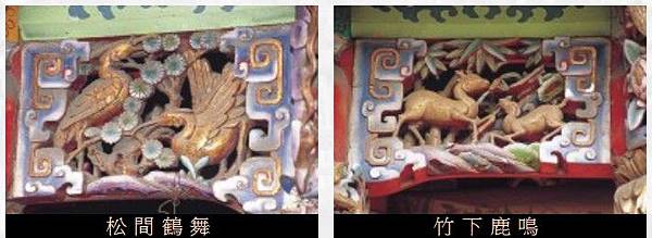 「松間鶴舞.竹下鹿鳴」,搭配「南極仙翁」與「麻姑獻壽」,極為傳統的題材,卻始終受報歡迎。南極仙翁的座騎為「仙鶴」,裝飾於寺廟之「龍爿」,表示對男性祝壽;而麻姑的座騎為「仙鹿」,裝飾於「虎爿」,對婦女祝壽之使用。許多題材中,也常應用「松鶴」與「竹鹿」,暗寓仙翁與麻姑,均為祝壽之意,這也是傳統題材能屹立不搖的原因