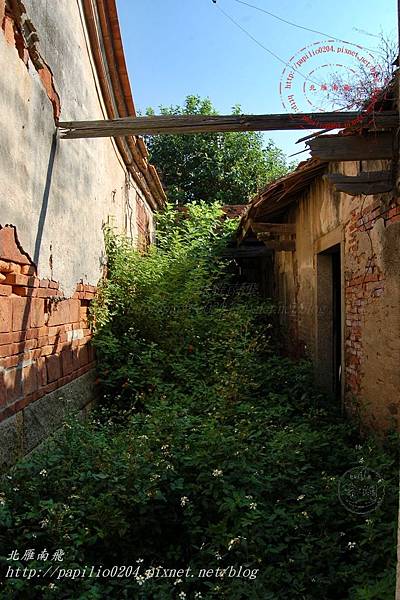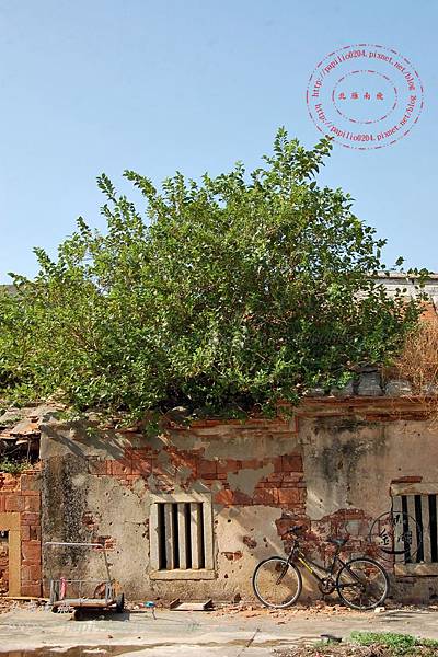 屋後的牆壁,紅磚上的灰泥也逐漸在時光之流的沖蝕下剝落。闐無人聲的午後,只有一部等待主人踅音的腳踏車倚牆而立,在同樣孤寂的人力車相伴下,靜觀光線在古厝野桑樹影下的變換。