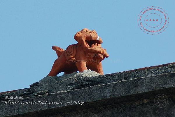 前落屋頂上的「風獅爺」造型與金門常見的造型不同,少了獅背上彎弓射箭的瓦將軍。這件文物的嘴部有修補的痕跡,與屋脊接觸的灰泥顏色也明顯與屋脊不同,或許是後來加置的屋脊辟邪物。