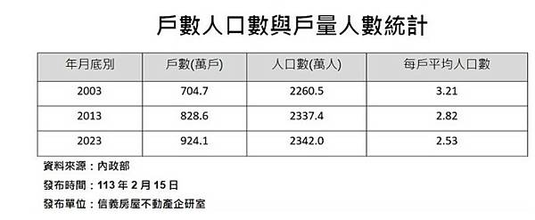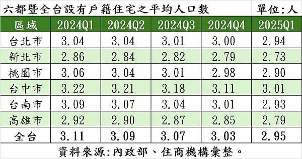 根據內政部統計,2025年第一季全台設有戶籍住宅的平均人口數降至2.95人,創下自2009年有紀錄以來歷史新低,也是首次跌破3人大關。