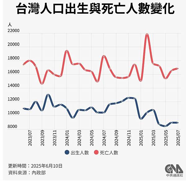 出生人數減死亡人數後,可計算出「人口自然增加」,台灣7月人口自然增加為負7907人;如果以遷入人數減遷出人數得出的「人口社會增加」計算,6月為負898人;整體計算自然增加與社會增加後,總人口較6月減少8805人。