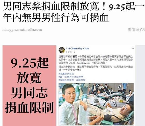 醫管局決定放寬男同性戀人士捐血限制,由以往永久不准捐血,改為只設一年暫緩期限,即是捐血前一年內都沒有男男性接觸,就可捐血,本月25日開始生效。早已「出櫃」的立會議員陳志全在fb表示,捐血禁令針對的,應該是不安全性行為,不是性傾向,「如果終身禁令是歧視,一年禁令也一樣!」