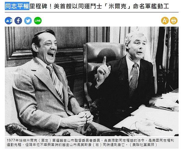 同志平權里程碑!美首艘以同運鬥士「米爾克」命名軍艦動工 - 國際 - 自由時報電子報
