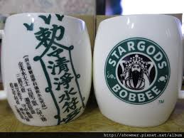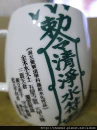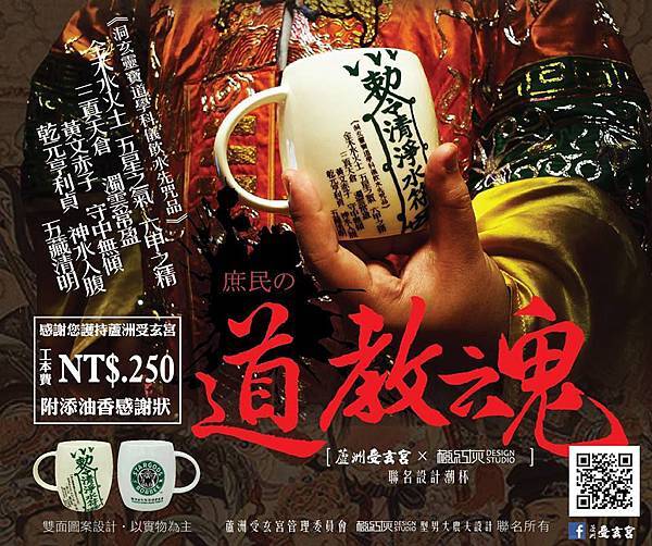 受玄宮「潮杯」設計者陳鴻輝,將「清淨水符」印於杯面。 「文創」正夯,傳統宗教也吹起文創風,不少宮廟結合信仰特色,推出文創品,如符咒潮杯、金爐造型撲滿等,成功製造話題,知名度也隨之大開,即使不是得天獨厚的知名大廟,小廟也能「揚眉吐氣」,爭取信徒認同。