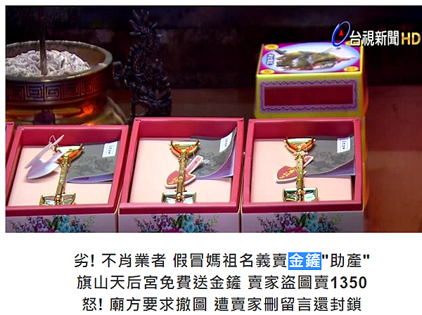 業者賣金鏟子竟假冒媽祖名義!高雄有百年歷史的旗山天后宮,最近幾年推出好運金鏟免費送,希望幫助求子夫妻順利懷孕,不過,竟然有不肖業者盜用廟方的照片,假借媽祖名義在網路上用1350元價格,販售非正版金鏟,廟方發現後要求撤圖,沒想到賣家竟刪留言還封鎖,讓廟方相當不滿。