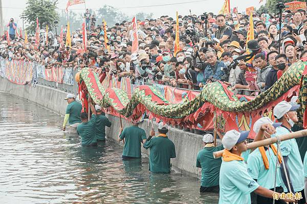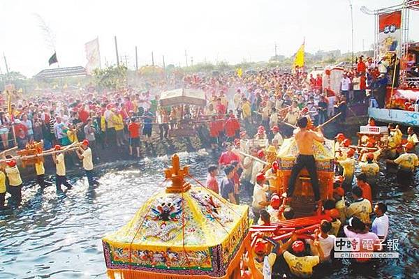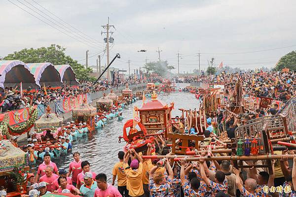今天數千名信眾塞爆會場,在代天巡狩令旗帶領下各神明神轎衝進水路繞行,儀式結束後信眾排成數公里長龍等著「鑽轎底」,祈求神明庇佑安康。