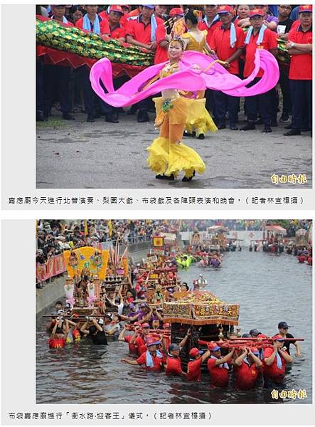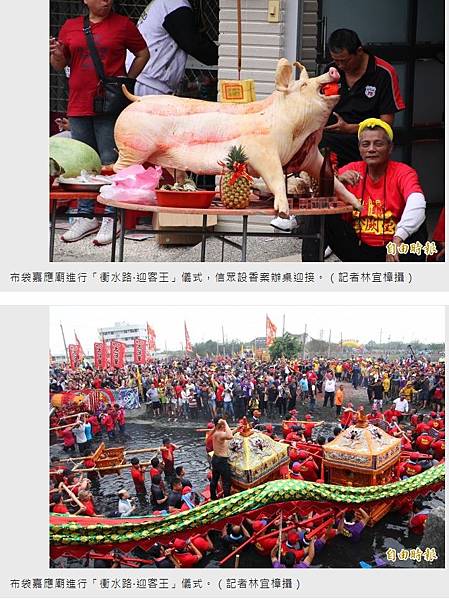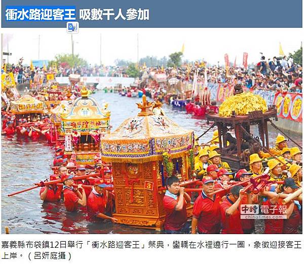 已有177年歷史的布袋鎮新塭嘉應廟「衝水路迎客王」祭典,昨日10多頂大小神轎在上千民眾圍觀下,爭先恐後衝進水路迎「客王」上岸,現場吆喝聲伴隨喧天鑼鼓,場面熱鬧,最特別的是,今年還有造價千萬,遠從竹北來的大王船駐駕參與盛會,吸引信眾朝聖。
