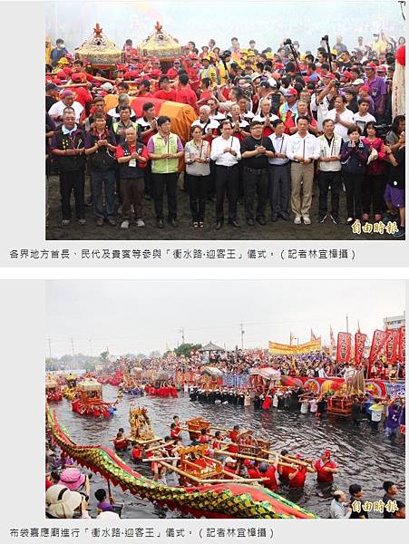 嘉義縣副縣長吳芳銘、立委蔡易餘、布袋鎮長陳鳳梅、義竹鄉長顏蔡淑惠、縣議員蔡信典、蔡瑋傑及民進黨提名嘉義縣長參選人翁章梁等今天參與盛事;新塭嘉應廟主委蘇國輝主持儀式,他說,嘉應廟「衝水路‧迎客王」已有180年歷史,是當地最大的宗教盛事,感謝各界熱情參與。