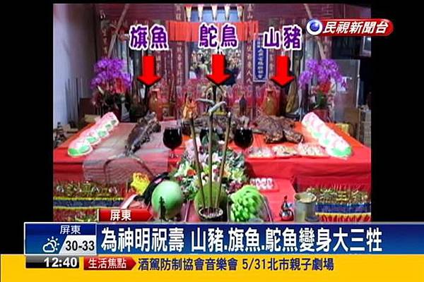 台灣民間信仰,拜拜的時候要用三牲,指的是雞、豬、魚,但屏東一間廟宇,昨天(17日)為了要給神明祝壽,特別準備了超大牲禮,把三牲改成了大山豬、大旗魚,雞甚至改用大鴕鳥來代替,讓人大開眼界。