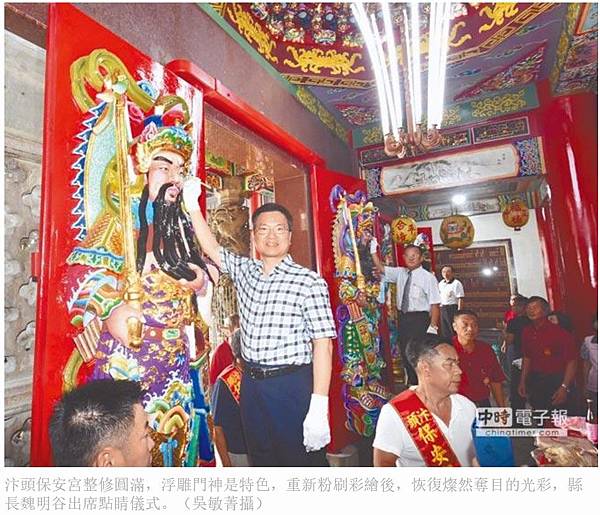 汴頭保安宮整修圓滿,浮雕門神是特色,重新粉刷彩繪後,恢復燦然奪目的光彩,縣長魏明谷出席點睛儀式。(吳敏菁攝)