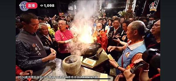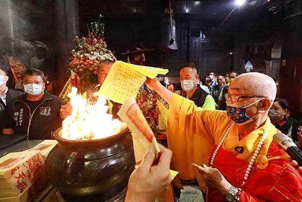 白沙屯媽祖北港進香重要儀式進火,疏文一張一張放入萬年香火中焚燒。(擷取自北港朝天宮臉書影片)