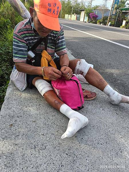〔記者黃旭磊/台中報導〕1名雙腳腳跟包紮白布,由左腳拖著右腳跛行的「勇腳阿伯」,昨天(週六)深夜搭乘海軍陸戰隊退役軍人座車抵達北港朝天宮,「勇腳阿伯」從拱天宮一路追隨媽祖走到彰化,路程上百公里,深夜堅持不上車稱「承諾媽祖有辦法走到」,由信眾合力勸說「媽祖派兵馬來載你到北港」才放棄步行。