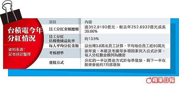 台積電員工分紅 平均近93萬