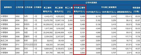2021年度員工平均薪資福利最高的排名,第一名是瑞鼎646.6萬,第二是聯發科546萬、第三名聯詠541.2萬,後面依序為矽創522.5萬、瑞昱513.1萬、晶豪科482.5萬、日月光投控458.4萬、長榮427.1萬、聯華407.7萬、祥碩388.2萬。而被譽為「護國神山」的台積電去年平均薪資福利為270.6 https://bit.ly/3PYeC0Y
