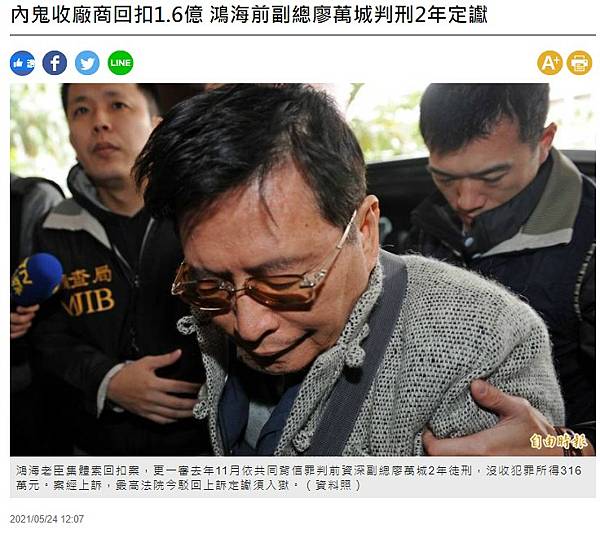 內鬼收廠商回扣1.6億 鴻海前副總廖萬城判刑2年定讞 - 社會 - 自由時報電子報 https://bit.ly/2Tkye6G