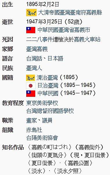 1.張炎憲、高淑媛、王昭文、李彩綉,〈陳澄波,第二部分〉《嘉義驛前二二八》,吳三連台灣史料基金會,1995。