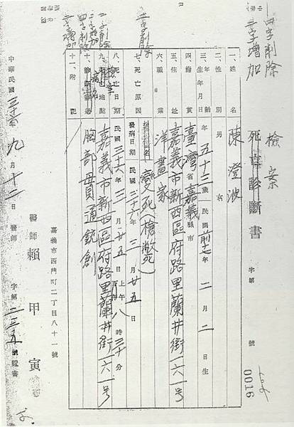陳澄波於3月25日死亡,礙於當時風聲鶴唳,半年後才請鄰居醫師賴甲寅開立死亡證明。
