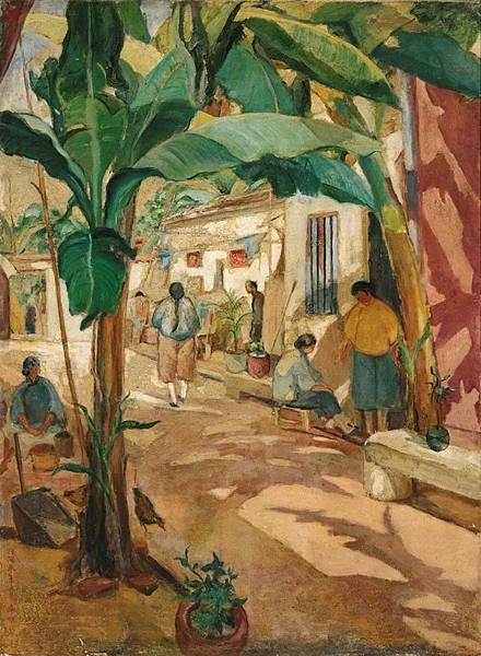 曾入選日本第九屆帝展的《芭蕉の庭》(有香蕉樹的院子)(1928),現今存於臺北市立美術館。 圖片來源,臺北市立美術館。